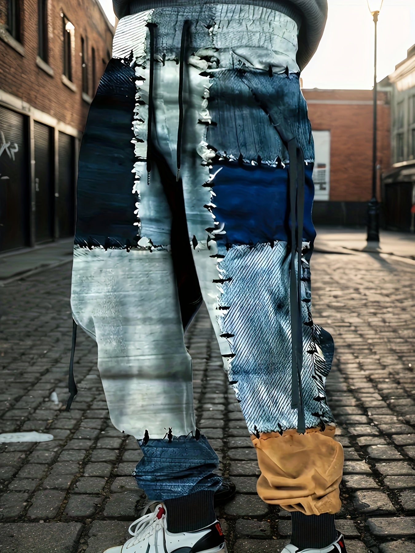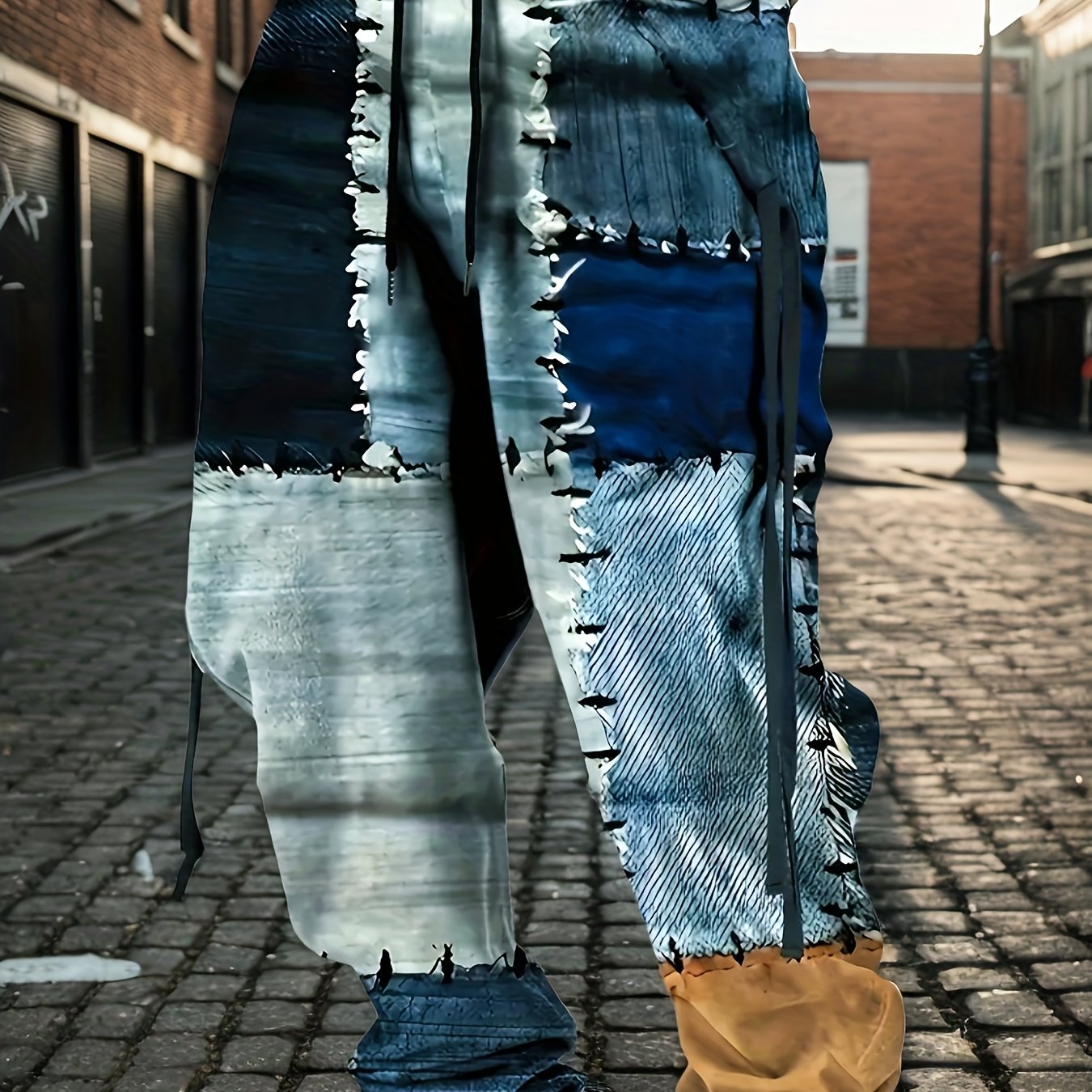 These casual jogging pants are a stylish and comfortable choice for sports, running, or everyday wear. Made from a knit fabric blend of 50% cotton and 50% polyester with a slight stretch, they have a regular fit and a soft, comfortable feel. The pants feature a patchwork-style print and a drawstring for an adjustable fit. With their medium-weight fabric, they're perfect for fall and winter.